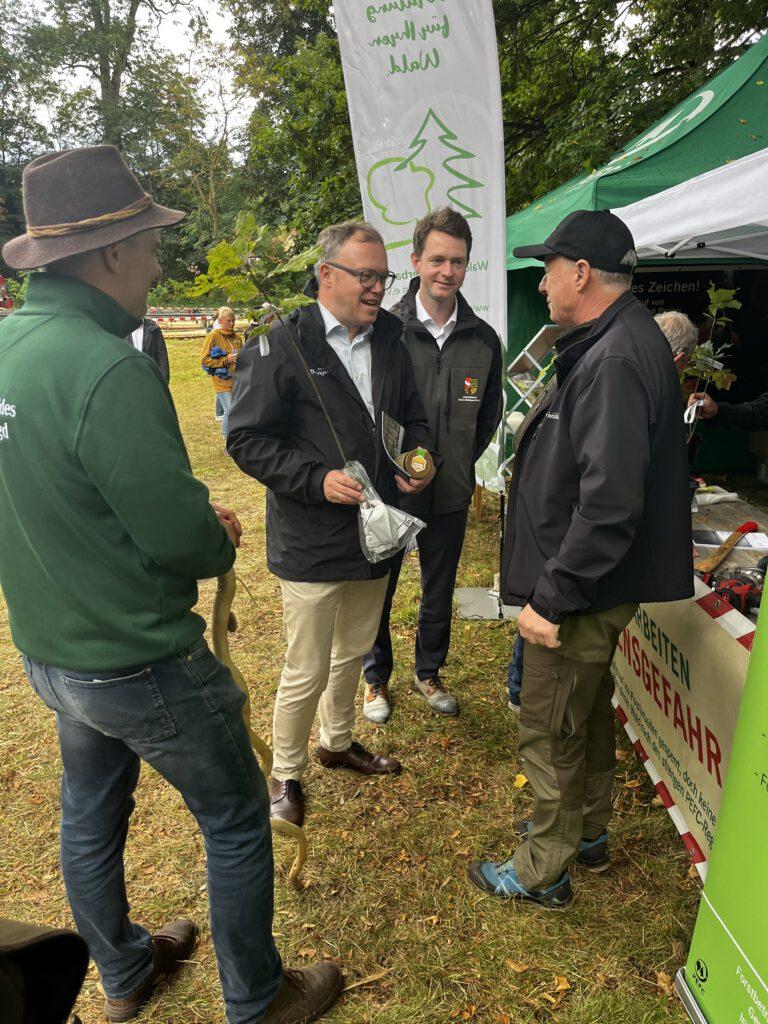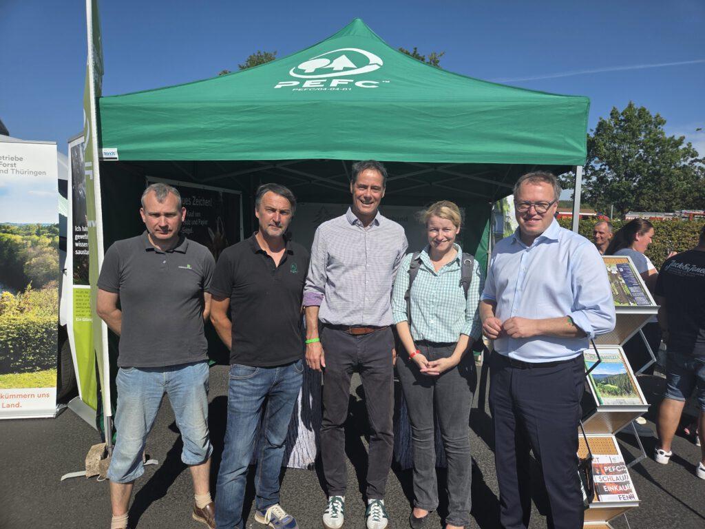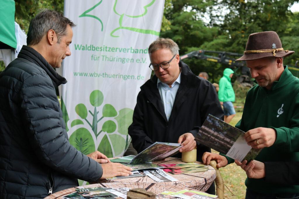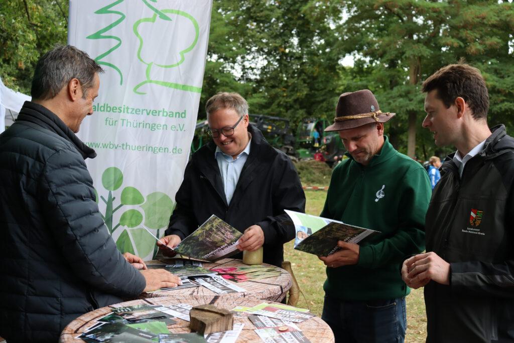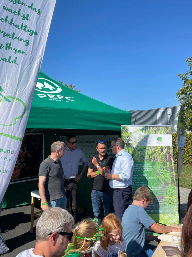 An unserem Stand konnten wir u. a. wieder Mario Voigt (Schirmherr der Veranstaltung) Sören Sterzig (Vorsitzender der Regionalen PEFC-Arbeitsgruppe Thüringen), Corinna Geisler (Leiterin des FFK-Gotha) und den Bürgermeister des Amtes Creuzburg, Rainer Lämmerhirt begrüßen. Mit Umweltminister Tilo Kummer konnte lange über die Perspektiven der Privatwaldbewirtschaftung, alternative Einkommensmöglichkeiten und die Honorierung von Ökosystemleistungen durch eine Anpassung der Förderung diskutiert werden. Natürlich waren auch die vielschichtigen Probleme bei der diesjährigen Fördermittelbeantragung ein Thema.